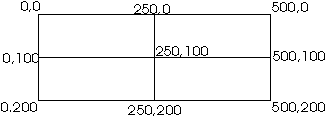 Een korte uitleg is misschien wel op z'n plaats. Het plaatje heeft een afmeting van 500x200 pixels. Anders dan gebruikelijk staat de oorsprong (0,0) linksboven. de rechteronderhoek heeft dus als coördinaten 500,200.Als we het plaatje in vier gelijke vlakken verdelen worden dit de coördinaten: